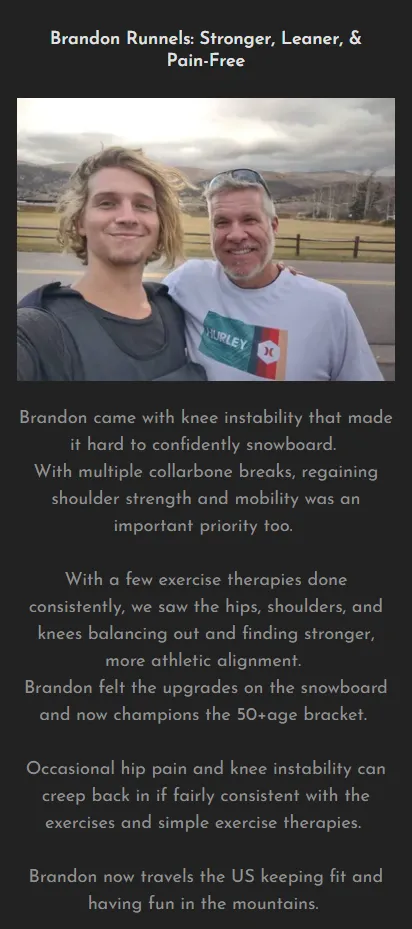 We got to know what the cause of his knee pain and instability was and tailored exercise solutions that worked to free him from pain and allow him to play harder and keep up with friends in the mountains.